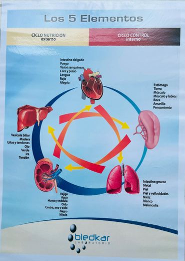 Pósters de oreja, teoría de los 5 elementos y de órganos y sus referencias.